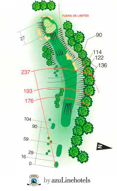 Par 4 ancho con un desnivel lateral de izquierda a derecha en la calle. El segundo golpe es a un green profundo en alto y con un bunker frontal.