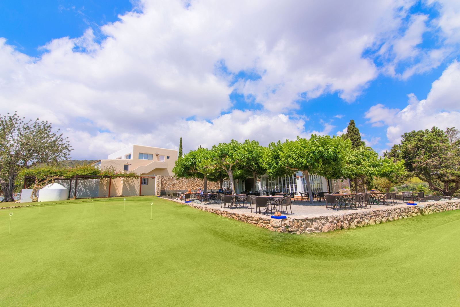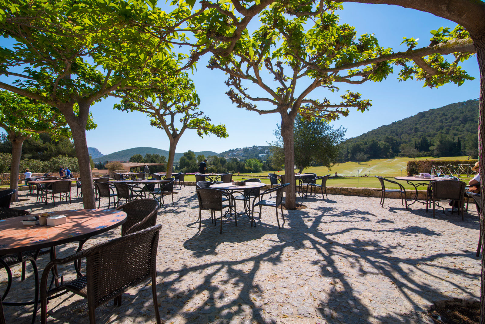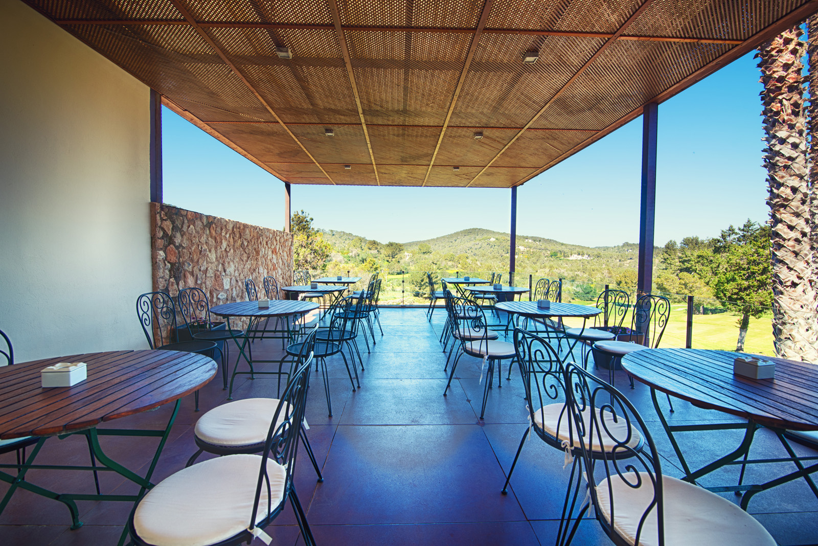 El restaurante ofrece dos ambientes diferentes, uno con vistas al campo de 9 Hoyos y el otro con vistas al campo de 18 Hoyos, ambos con un peculiar paisaje característico de la isla de Ibiza.